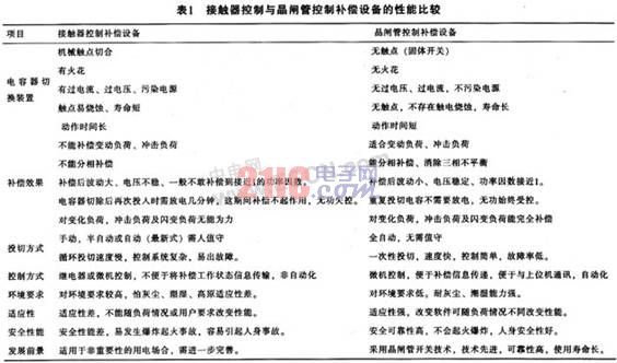 利用接觸器控制補(bǔ)償設(shè)備與用晶閘管控制方法來(lái)補(bǔ)償設(shè)備的性能比較如表1所列。