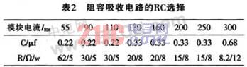 模塊過(guò)壓保護(hù)一般也可采用阻容吸收法。對(duì)于持續(xù)時(shí)間較短,能量不大的過(guò)電壓,一般可在模塊兩端并聯(lián)阻容吸收電路,用吸收電容把過(guò)電壓的電磁能量變成靜電能量存貯起來(lái)。而用吸收電阻不但可以防止電路振蕩,還可限制晶閘管導(dǎo)通時(shí)電容放電所產(chǎn)生的開(kāi)通損耗和di/dt值。并聯(lián)在晶閘管開(kāi)關(guān)模塊的RC值可參考表2。