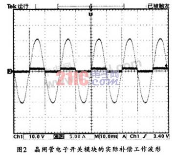 在無(wú)功補(bǔ)償實(shí)際應(yīng)用中,可將晶閘管電子開(kāi)關(guān)模塊用在TSC低壓無(wú)功補(bǔ)償以替代接觸器,這樣,就可以在開(kāi)關(guān)電壓過(guò)零時(shí)投入補(bǔ)償電容量,從而避免了沖擊電流的產(chǎn)生和瞬間電網(wǎng)電壓的波動(dòng)。圖2所示是其工作波形圖。
