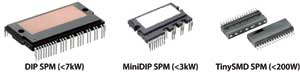 為了克服以上約束,最好采用智能功率模塊(intelligentpowermodule(IPM),也稱為SmartPowerModule(SPM®))。圖2所示為一個典型的全封閉模塊,它包含一個完整的三相電壓源變頻器,以及相應的柵極驅動器和保護電路。采用這種模塊比分立元件方案節省電路板空間多達50%。尤其是這種模塊需要的外接部件極少,在設計上就考慮了EMC的要求。其峰值和平均EMC干擾強度比傳統設計低很多。