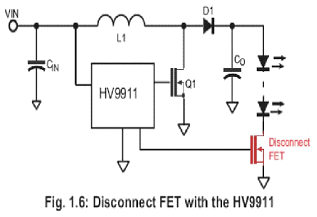 這個放電電容同時也會使得電路重新連接動作時,LED電流的上升時間會被拉長。因此,避免輸出電容的放電是相當重要的。IC輸出FAULT信號斷接FET,使得LED的電流幾乎立刻的下降到零電流,因此輸出電容并沒有被放電,所以當PWMD信號回復High位準時輸出電容不需要額外的充電電流,這使得上升時間非??焖?。
