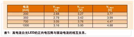為了確保最佳的性能和長(zhǎng)久的工作壽命,LED需要一個(gè)有效的驅(qū)動(dòng)電路。這些特殊的驅(qū)動(dòng)電路必須能夠從一根相當(dāng)苛刻的汽車電源總線獲取工作電源,而且還應(yīng)兼具成本和空間“效益性”。為了維持其長(zhǎng)久的工作壽命,一定不得超過LED的電流和溫度限值。表1羅列了針對(duì)一個(gè)高電流白光LED的典型正向電壓與驅(qū)動(dòng)電流的相互關(guān)系。