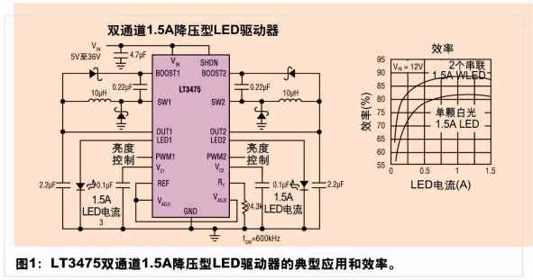 LT3475是一款雙通道、36V、2MHz降壓型DC/DC轉(zhuǎn)換器,專為用作恒定電流雙LED驅(qū)動(dòng)器而設(shè)計(jì)(見圖1)。每個(gè)通道具有一個(gè)內(nèi)部檢測(cè)電阻器和調(diào)光控制功能,從而使其非常適合于驅(qū)動(dòng)那些需要高達(dá)1.5A電流的LED。一個(gè)通道的開關(guān)操作與另一個(gè)通道異相180°,因而使得兩個(gè)通道的輸出紋波均有所減小。每個(gè)通道均獨(dú)立地在一個(gè)50mA至1.5A的寬電流范圍內(nèi)保持了很高的輸出電流準(zhǔn)確度,而獨(dú)特的TrueColorPWMTM電路提供了一個(gè)3000:1的調(diào)光范圍,且未發(fā)生任何的色偏移(這種現(xiàn)象在LED電流調(diào)光中很常見)。