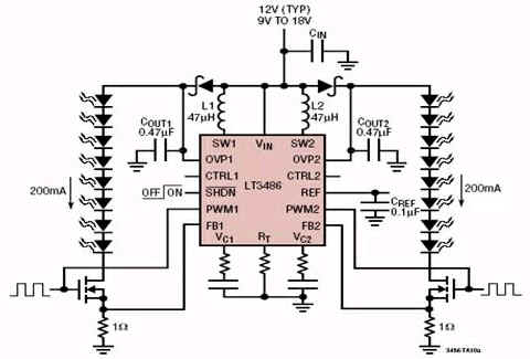 為了實(shí)現(xiàn)這些LED剎車燈的性能和工作壽命的最大化,應(yīng)采用一種能夠驅(qū)動(dòng)這些剎車系統(tǒng)所需的紅光LED串的合適LED驅(qū)動(dòng)器,這是必不可少的。凌力爾特的LT3486便是專為此類汽車應(yīng)用而開發(fā)的。LT3486是一款雙通道升壓型DC/DC轉(zhuǎn)換器(如圖2所示),專為從一根12V至14V汽車總線以恒定的電流來驅(qū)動(dòng)多達(dá)16個(gè)LED(每個(gè)轉(zhuǎn)換器驅(qū)動(dòng)8個(gè)串聯(lián)LED)而設(shè)計(jì)。采用LED串聯(lián)的方式能夠提供相等的LED電流,從而獲得均勻的LED亮度。在需要的時(shí)候,兩個(gè)獨(dú)立的轉(zhuǎn)換器還能夠驅(qū)動(dòng)不對(duì)稱的LED串。