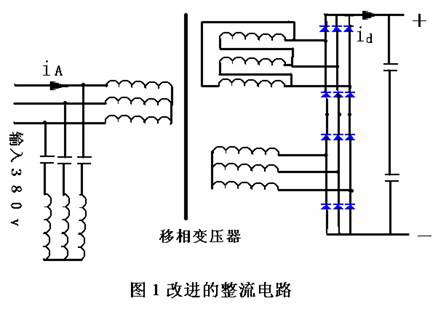 采用如圖1所示的12脈波整流電路,移相30°構(gòu)成串聯(lián)2重結(jié)電路,利用變壓器二次繞組接法的不同,使兩組三相交流電源間相位錯開30°,從而使整流輸出電壓在每個交流電源周期中脈動12次,故為12脈波整流電路。變壓器二次繞組分別采用星形和三角形接法構(gòu)成相位角相差30°、大小相等的兩組電壓,接到相互連接的整流橋上。