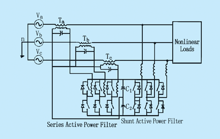 串聯型APF是從1980年未引用于電網的,它主要作為電壓調節器及電網與非線性負荷之間的諧波隔離器而工作的。圖7為串聯APF的接線圖,通過匹配變壓器將APF串聯于電源和負荷之間,以消除電壓諧波、平衡或調正負荷的端電壓,可確保用戶供電的電壓質量,尤其適合于補償交流電源及小功率應用中的電壓不平衡與電壓的下陷。因不需能量貯備(蓄電池),元器件的總定額較小,對UPS更為經濟有效。串聯APF注入與電源電壓串聯的電壓分量,故可視為一可控的電壓源,補償負荷側的電壓下陷和上凸。但串聯型APF損耗較大,且各種保護電路也較復雜,故很少單獨使用。經常用它與無源LC濾波網絡組成混合型APF。