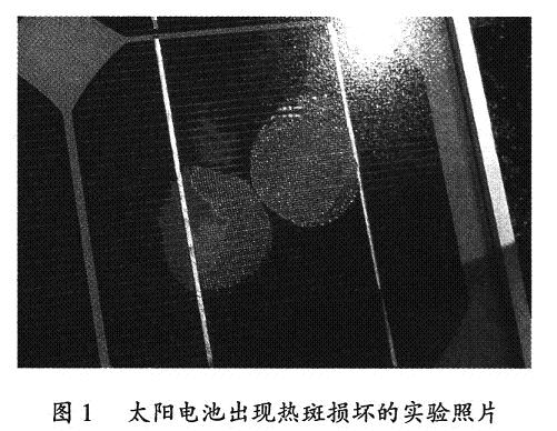 太陽(yáng)電池?zé)岚呤侵柑?yáng)電池組件在陽(yáng)光照射下,由于部分組件受到遮擋無(wú)法工作,使得被遮蓋的部分升溫遠(yuǎn)遠(yuǎn)大于未被遮蓋部分,致使溫度過(guò)高出現(xiàn)燒壞的暗斑,如圖1所示。熱斑可能導(dǎo)致整個(gè)電池組件損壞,造成損失。因此,需要研究造成熱斑的內(nèi)在原因,從而減小熱斑形成的可能性。太陽(yáng)電池?zé)岚叩男纬芍饕蓛蓚€(gè)內(nèi)在因素構(gòu)成,分別與內(nèi)阻和太陽(yáng)電池自身暗電流大小有關(guān)。