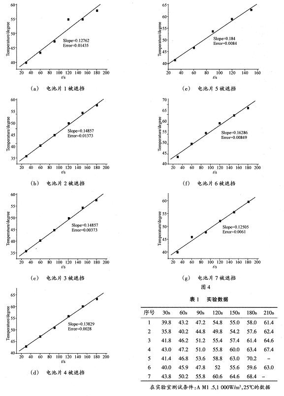 為了驗(yàn)證遮擋造成的溫度變化,我們?cè)趯?shí)驗(yàn)室進(jìn)行了測(cè)試來(lái)加以驗(yàn)證。如圖3(a)~圖3(g)所示,是在實(shí)驗(yàn)室模擬陽(yáng)光照射,對(duì)一塊多晶硅太陽(yáng)電池組件隨機(jī)挑選7塊硅片遮蓋所作的升溫實(shí)驗(yàn)曲線圖表,用Origin7.0軟件進(jìn)行的擬合: