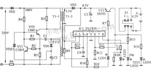 該電路主要由一塊軟塑封集成塊IC1(YLT539)和三極管VT3等組成。從變壓器T的1-3繞組感應出的交流電壓5.5V經二極管VD3整流、電容C3濾波后,輸出一個直流8.5V左右電壓(空載時),該電壓一部分加到三極管VT3的e極;另一部分送到軟塑封集成塊IC1(YLT539)的1腳,為其提供工作電源。集成塊IC1有了工作電源后開始啟動工作,在其8腳輸出低電平充電脈沖,使三極管VT3導通,直流8.5V電壓開始向電池E充電。