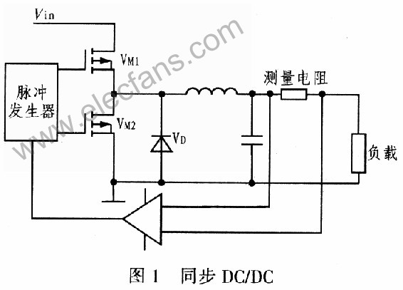 [page]Vin為輸入電壓,VM1、VM2為MOSFET,VM1導通寬度決定輸出電壓大小,快恢復二極管和VM2共同續流電路,整流管的導通損耗占據最主要的部分,因此它的選擇至關重要,試驗中選用通態電阻很低的M0SFET。電感、電容組成濾波電路。測量電阻兩端電壓與給定值比較后,通過脈沖發生器產生相應的脈寬,保持負載電流穩定。VM1關斷,快恢復二極管工作,快恢復二極管通態損耗大,VM2接著開通續流,減少系統損耗。