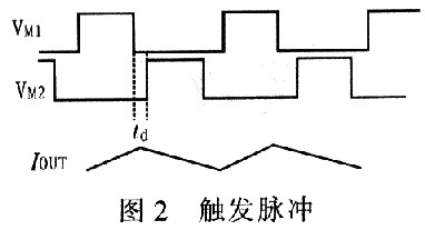 ;VM1關斷,電流通過VD續流,接著VN2導通。由于VM2的阻抗遠小于二極管阻抗,因此通過VM2續流。VMl、VN2觸發脈沖如圖2所示。圖2中td為續流二極管導通時間。