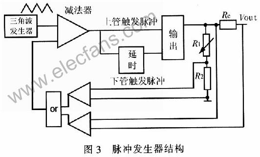 系統采用了電流負反饋電路,以適應激光二極管的要求。當負載變化,電流略大于給定電流時,減小ton寬度,電壓降低。電流略小于給定電流時,增加ton寬度,這樣可以維持電流穩定。圖3所示為脈沖發生器結構。