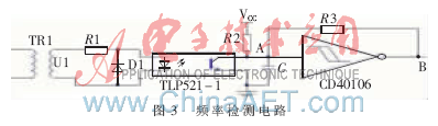 單片機對常用和備用電源進行頻率檢測,根據檢測的結果來判斷電源是否發生故障,然后進行相應的控制操作。頻率檢測電路主要以光耦TLP521-1和施密特觸發器CD40106為主要器件構成。頻率檢測的硬件電路如圖3所示。電網中的交流電經變壓器后變換為電壓較低的交流信號U1,U1經過光耦TLP521-1后就變成了同頻率的方波信號。為了防止光耦內部的二極管被反向電流擊穿,在光耦外部反向接了1個二極管。為了使光耦輸出的方波信號更加規整,為單片機測量頻率做好準備,在光耦的輸出級加了施密特觸發器CD40106。利用PIC16F884單片機的輸入捕捉(CCP)功能記錄第一個上升沿的時間t1和下一個上升沿的時間t2,則信號的周期T=(t2-t1)μs。為了提高測量的精度,采用多次測量取平均值的方法來實現。
