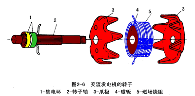 轉(zhuǎn)子軸上壓裝著兩塊爪極,兩塊爪極各有六個(gè)鳥嘴形磁極,爪極空腔內(nèi)裝有磁場(chǎng)繞組(轉(zhuǎn)子線圈)和磁軛。集電環(huán)由兩個(gè)彼此絕緣的銅環(huán)組成,集電環(huán)壓裝在轉(zhuǎn)子軸上并與軸絕緣,兩個(gè)集電環(huán)分別與磁場(chǎng)繞組的兩端相連。