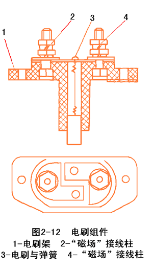 后端蓋上裝有電刷組件,有電刷、電刷架和電刷彈簧組成。電刷的作用是將電源通過集電環(huán)引入磁場(chǎng)繞組。見圖2-12