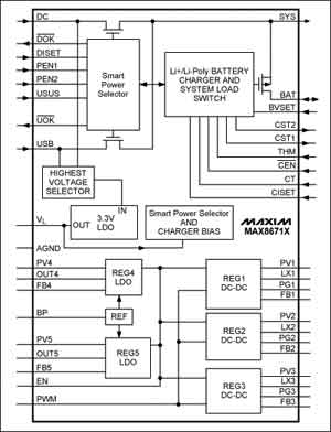 因?yàn)镸AX8671X可以無縫管理USB和交流適配器電源,使得制造商能夠省去AC/DC墻上適配器充電零配件,從而降低了系統(tǒng)成本。其集成了眾多功能:電池充電器、適配器-USB-電池開關(guān)、系統(tǒng)電壓調(diào)節(jié)以及各種檢測(cè)功能(見圖1)。5路獨(dú)立的集成穩(wěn)壓器(3路2MHz開關(guān)降壓型調(diào)節(jié)器,效率高達(dá)96%;2路低靜態(tài)電流的線性穩(wěn)壓器)可以為多個(gè)子系統(tǒng)提供高效供電。