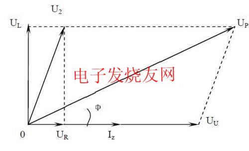 光伏發(fā)電并網(wǎng)運(yùn)行時(shí)的電路原理如圖2所示。Up為逆變器輸出電壓,Uu為電網(wǎng)電壓,R為線路電阻,L為串聯(lián)電抗器,Iz則為回饋電網(wǎng)的電流。為保證回饋功率因數(shù)為1,回饋電流的相位必須與電網(wǎng)電壓的相位一致。以電網(wǎng)電壓Uu為參考,則Iz與Uu同相位,其矢量圖如圖3所示。內(nèi)阻R兩端的電壓UR與電網(wǎng)電壓相位一致,而電抗器兩端電壓UL的相位則落后于UR90º.由此可以求得UP的相位和幅值: