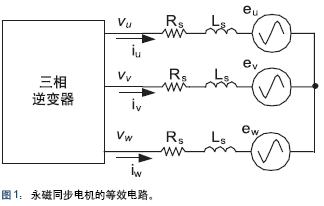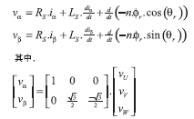 最新無傳感器算法基于如圖1所示的永磁同步電機的簡化模型,電機繞組反電勢波形為轉子角度的正弦函數,因而能夠用于測量轉子角度。通過測量外加定子電壓時流入定子線圈的電流可以計算反電勢。為簡化數學運算,可以利用 Clarke變換將三相電路變換為兩相等效模型,這樣就可以用轉子角度的正弦和余弦函數表示反電勢,其等效電路可以由以下方程描述:
