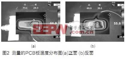熱源器件的功耗分析、熱源器件的熱距離布局面積計算以及熱源器件的環境溫度分析都完成后就可以開始PCB的布局了,PCB的布局需要遵循最基本的熱設計原則,如:熱點分散;將最高功耗和發熱最大的器件布置在散熱最佳位置;不要將發熱較高的器件放置在印制板的角落和四周邊緣;高熱耗散器件在與基板連接時應盡能減少它們之間的熱阻等,另外還要按照上面計算的壓縮熱間距布放熱源器件,在熱源器件的壓縮熱間距內盡量少布器件,更不能布放發熱器件,熱源器件的背面也要盡量少布器件,更不能布放發熱器件。圖1為本項目的最終PCB版圖,圖2為其溫度測量圖。由圖可見,本設計方法是實用的。