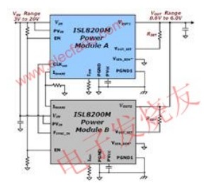 在一個有兩個模塊的操作中,與FSYNC_IN連接的模塊的開關頻率將為180°異相。對于并聯的兩個以上模塊,相位控制是根據數據表建議,通過在PH_CNTRL或相位控制引腳增加一個電阻分壓器來調整的。利用各自異相編程開關頻率的多相操作,能夠實現降低外部噪聲或紋波。這減少了滿足給定負載點關鍵輸出的電壓調節要求所需的外部電容或電容器的數量。最后,ISHARE引腳之間必須連接起來。這個引腳是用來平衡每個模塊的負載電流。在這個連接接入了一個電阻RISHARE,以便設置總輸出電流。模塊ISET引腳的一個附加電阻用來建立一個內部電壓,用于比較ISHARE總線,以幫助平衡每個模塊的輸出電流。與目前市場上的同類解決方案相比,由于模塊之間的連接少了很多,而且在設計周期中幾乎不必考慮布局的敏感性,并聯操作的ISL8200M大大降低了復雜性。