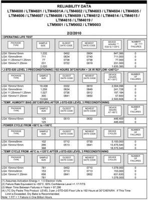 總共就DC/DC微型模塊產(chǎn)品進行了18項測試,其中有幾項測試是在不同溫度情況下進行的。這些數(shù)據(jù)是累計的,即自這些產(chǎn)品3年半以前推出以來,凌力爾特公司一直在監(jiān)視和更新這些數(shù)據(jù)。凌力爾特公司嚴格更新這份報告,而且可在線提供報告副本。要求報告副本并無需滿足任何特殊要求。凌力爾特公司以這種方式支持其高性能微型模塊產(chǎn)品線,其中包括DC/DC系列(除了DC/DC產(chǎn)品,還提供混合信號微型模塊器件,如LTM9003和LTM2881)。