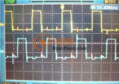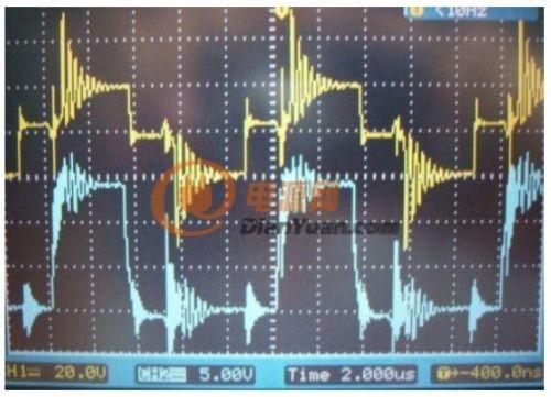 在談驅(qū)動(dòng)問(wèn)題前,先上一幅實(shí)測(cè)的推挽逆變電路的其中一邊MOS管的G極波形(1:1藍(lán))與升壓變壓器的副邊電壓波(15:1黃),這是電路處在滿載1000WDC+24V輸入時(shí)的實(shí)測(cè)波形,可以看到另一路MOS管導(dǎo)通時(shí)串入到截止MOS管的G極的干擾尖刺波形。