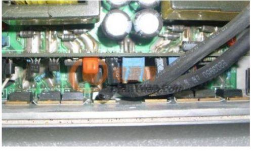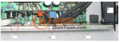 攝氏25度環(huán)境時(shí),輸出滿載1000W,10分鐘后圖片B處(8個(gè)MOS管的中心位置)的溫度比A處高出6~8度!C處(綠圈)最低,比B處低14~15度!(C處為進(jìn)風(fēng)口,D為風(fēng)扇,樣機(jī)為進(jìn)風(fēng)設(shè)計(jì),據(jù)說(shuō)是用以延長(zhǎng)含油軸承的壽命),同樣型號(hào)并聯(lián)工作的功率MOS管,實(shí)際工作的溫差那么大,自然對(duì)“均流”是極其不利!所以可靠性不高就不足為怪了。