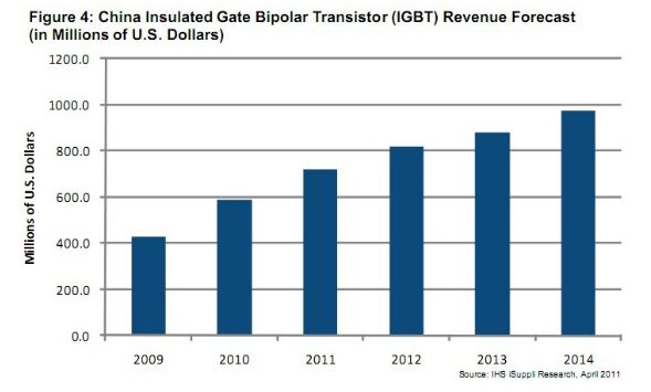 據IHS iSuppli公司的研究,由于工業與消費領域的需求增長,中國絕緣柵雙極型晶體管(IGBT)市場未來幾年將快速增長,2014年銷售額將從2009年的4.297億美元上升到9.75億美元,增長一倍以上。