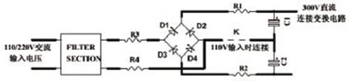 浪涌電流的抑制方法有很多,一般中小功率電源中采用電阻限流的辦法抑制開機浪涌電流。圖2是一個常見的110V/220V雙輸入電源示意圖,以此為例,我們分析一下如何使用NTC熱敏電阻進行浪涌電流的抑制。