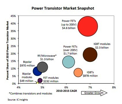 根據IC Insight的預測,整體功率電晶體市場營收將在2010至2015年間,取得6.4%的復合年平均成長率(CAGR),在2015年達到163億美元規模;同時期低電壓(200V以下)功率FET市場CAGR為6.7%,到2015年營收規??蛇_164億美元。