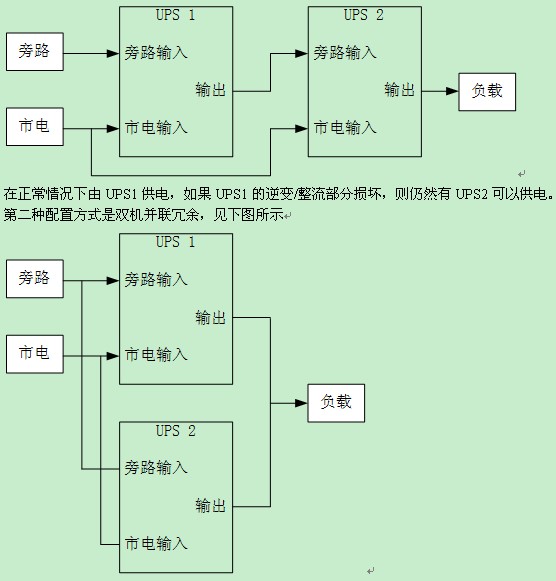 對(duì)于一般的UPS系統(tǒng)應(yīng)用來說,存在兩種常見的配置方式,一種是雙機(jī)熱備份,見下圖所示