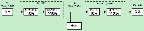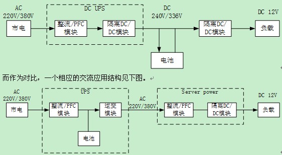 在UPS應(yīng)用的另外一個(gè)分支是目前正在興起的直流UPS系統(tǒng)。直流系統(tǒng)的思路是出于提高效率的目的,減少電源系統(tǒng)中間的轉(zhuǎn)換環(huán)節(jié),電力分配部分由原來的交流轉(zhuǎn)換成直流。一個(gè)理想的直流UPS系統(tǒng)服務(wù)器應(yīng)用從市電到12V終端的應(yīng)用結(jié)構(gòu)見下圖。