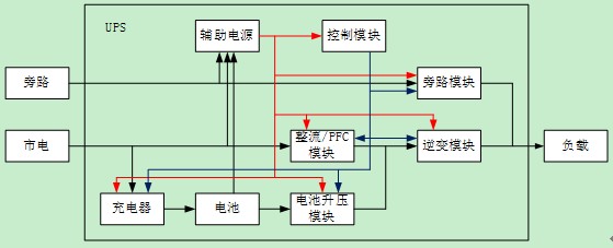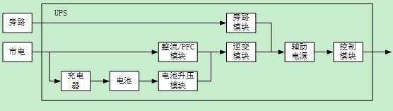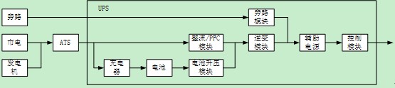 從單個(gè)UPS的設(shè)計(jì)來說,可以把整個(gè)產(chǎn)品按照模塊進(jìn)行劃分,下面圖中是一個(gè)典型的UPS系統(tǒng)結(jié)構(gòu)圖