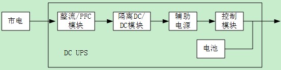 在這種直流UPS體系里面,不存在交流UPS中的旁路回路了,只存在一個(gè)市電到電池回路,這個(gè)回路也兼有充電器的作用。因此從單個(gè)UPS的可用靠性角度考慮,直流UPS可靠性鏈路只有兩條,其中一條是兩級(jí)變換加上輔助電源與控制板,另外一條是電池,見下圖所示
