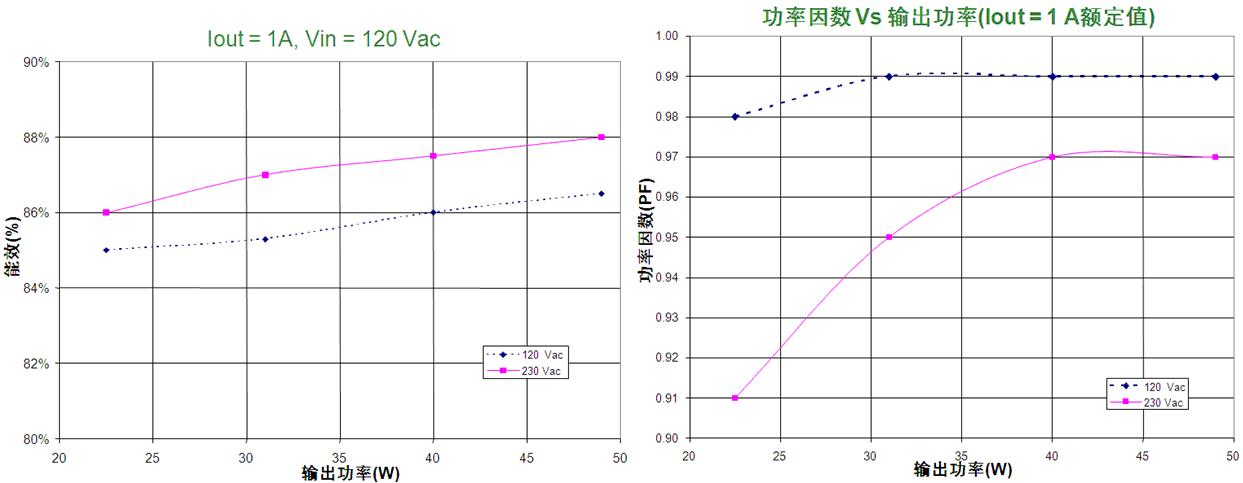 這90 W恒壓恒流演示板接受90至265 Vac的擴展通用輸入電壓(更換元件條件下可支持305 Vac),提供0.7 A至1.5 A的恒定電流輸出范圍(可通過微幅調(diào)節(jié)電阻來選擇)及30 V至55 V的恒定輸出電壓范圍(可通過電阻分壓器來選擇),最大輸出功率90 W,支持50至1,000 Hz調(diào)光控制,并包含可連接至可選調(diào)光卡的6引腳接口,用于模擬電流調(diào)節(jié)/雙亮度等級數(shù)字調(diào)光等智能調(diào)光應(yīng)用。此外,這演示板還提供短路保護、開路保護、過溫保護、過流保護及過壓保護等豐富保護特性。測試顯示,這演示板在50 W輸出功率、1,000 mA輸出電壓/48 V正向壓降條件的能效高于87%(詳見表1),在50%至100%負載條件下功率因數(shù)高于0.9,同時符合IEC61000-3-2 C類設(shè)備諧波含量標(biāo)準(zhǔn)。