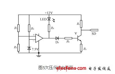 欠壓保護電路如圖5所示,它監測蓄電池的電壓狀況,如果蓄電池電壓低于預設的10.8V,保護電路開始工作,使控制器SG3524的腳10關斷端輸出高電平,停止驅動信號輸出。