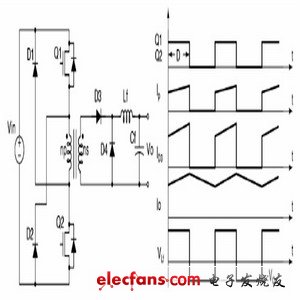 雙管正激變換器的原理圖與波形如圖1所示。雙管正激變換器的工作可以分為三個過程:能量轉(zhuǎn)移階段、變壓器磁復位階段和死區(qū)階段。在能量轉(zhuǎn)移階段,原邊的兩個開關都導通,能量從輸入端向輸出端轉(zhuǎn)移。在變壓器磁復位階段,原邊的兩個二極管都導通,使變壓器繞組承受反相輸入電壓,從而實現(xiàn)變壓器磁復位。當變壓器完全復位后,變換器工作在死區(qū)階段,即原邊無電流、副邊續(xù)流。在復位過程中,雙管正激開關MOSFET被箝位在輸入電壓。MOSFET上的電壓應力小于單管正激,至少低一倍。這樣我們可選取具有低導通電阻Rdson的低電壓MOSFET,以獲得低損耗。