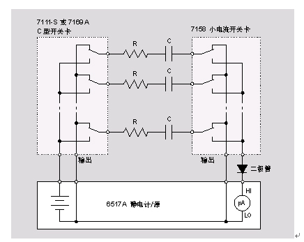 一個“同軸三柱-BNC”轉換器(7078-TRX-BNC型)被用于將6517A連接到7158型開關卡。電容器通過低噪聲同軸電纜連接到7158型開關卡。可使用絕緣線將7111-S開關卡連接到電容器。7169A型是通過接線頭連接器進行連接。