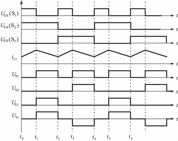 開關(guān)管S1、S2、S3的驅(qū)動信號,以及開關(guān)管所承受的電壓波形、電感L1中的電流波形,如圖2 所示。