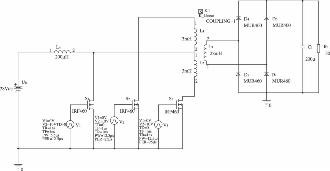 輸入直流電壓:Uin = 28 VDC; 輸出直流電壓:Uo= 270 VDC; 變壓器原、副邊匝比:n = 5; 升壓電感:L4= 200 μH; 輸出濾波電容:C1 = 200 μF; 開關(guān)管:IRF460; 功率二極管:MUR460。
