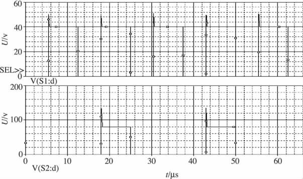 為了驗(yàn)證上述分析,下面應(yīng)用PSPICE 電路仿真軟件對這種推挽式Boost DC /DC 變換電路進(jìn)行建模仿真,觀察其仿真波形。
