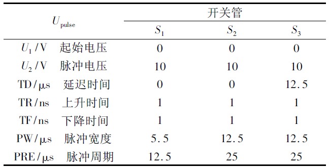 此仿真開關(guān)管的驅(qū)動信號采用脈沖信號激勵源VPULSE,其主要有7 個參數(shù)設(shè)置。