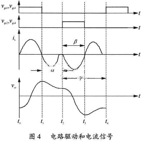 電路的諧振槽路的電流波形和驅動信號波形如圖4所示,通過調節α角控制變換器的輸出功率。