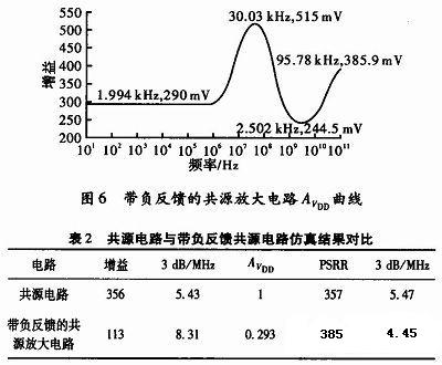 由于負(fù)反饋保證了輸出端電壓跟隨輸入端電壓,穩(wěn)定了電路。且抑制了來自像電源等其它節(jié)點(diǎn)的干擾,并給出了較低的電源到輸出端的增益,因而改善了整個(gè)電路的PSRR。