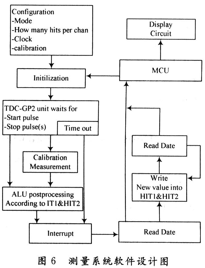 初始化之后,TDC-GP2高速測量單元接收到START脈沖后開始工作,達(dá)到設(shè)置的采樣數(shù)或者遇到測量溢出后才停止工作。軟件設(shè)計的重點在于根據(jù)需要設(shè)置TDC-GP2的工作模式和讀取其內(nèi)部的測量數(shù)據(jù)。在測量結(jié)尾,ALU開始依照HIT1和HIT2的設(shè)置處理數(shù)據(jù)并把結(jié)果送入輸出寄存器。如果不進(jìn)行校準(zhǔn),ALU傳輸16位原始數(shù)據(jù)到輸出寄存器;如果進(jìn)行校準(zhǔn),則ALU傳輸32位的固定浮點數(shù)到輸出寄存器。然后通過單片機(jī)AT89S52處理后,在液晶顯示器讀取時間間隔數(shù)據(jù),其測量流程如圖6所示。