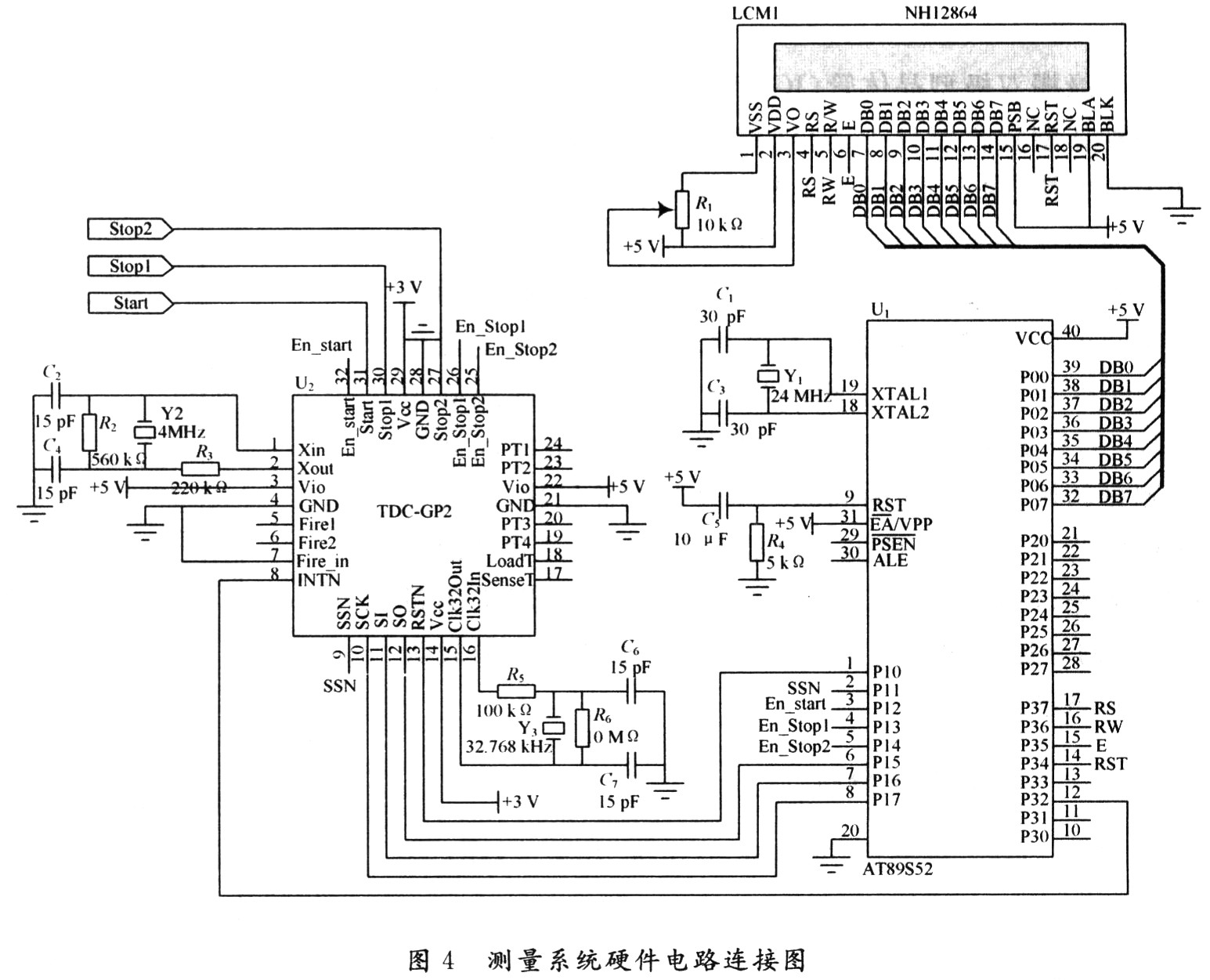 系統(tǒng)主要由脈沖信號取樣器、脈沖輸入信號整形電路、TDC-GP2測量電路、AT89S52單片機(jī)、液晶顯示電路、電源電路、時鐘電路組成。TDC-GP2的每個測量通道都提供一個使能引腳,可獨立地設(shè)置這兩個引腳進(jìn)行通道選擇。TDC-GP2需要一個2~8 MHz的高速時鐘進(jìn)行校準(zhǔn)用。TDC-GP2只是在進(jìn)行時間測量時才必須用振蕩器,且能夠自動控制振蕩器的開啟時間。整個系統(tǒng)的硬件電路連接如圖4所示。
