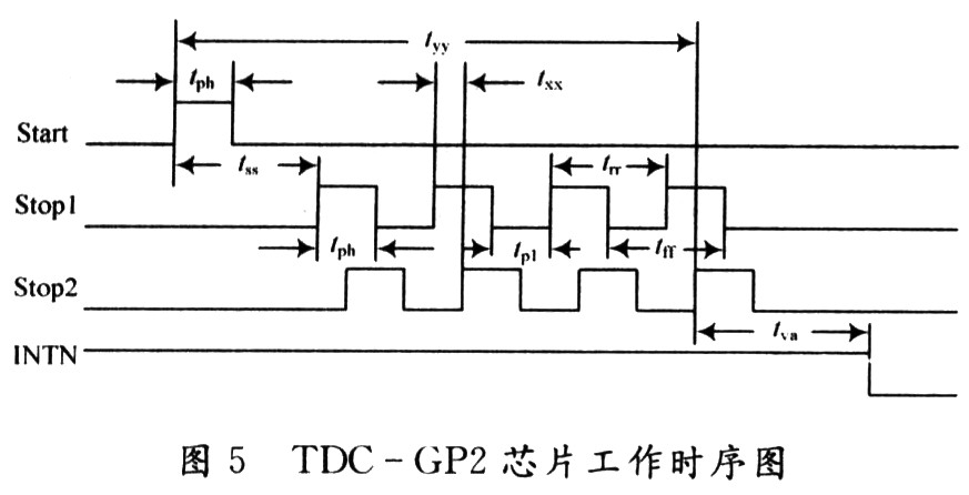 該系統(tǒng)主要由脈沖產(chǎn)生器、數(shù)據(jù)處理單元、時間數(shù)字轉(zhuǎn)換器、溫度測量單元、時鐘控制單元、配置寄存器以及與單片機(jī)相接的SPI接口組成。在實際應(yīng)用中,由于TDC-GP2的功耗很低,使得TDC-GP2的輸入/輸出電壓(工作電壓)為1.8~5.5 V,核心電壓為1.8~3.6 V,所以可以采用電池供電,使用方便。同時單片機(jī)由4線的SPI接口相連,可以把TDC-GP2作為單片機(jī)的一個外圍設(shè)備來操作。通過內(nèi)部ALU單元計算出時間間隔,并將結(jié)果送入結(jié)果寄存器保存起來。通過對TDC-GP2內(nèi)部寄存器的設(shè)置,可以多次采樣并將結(jié)果保存。TDC-GP2是基于內(nèi)部的模擬電路測量“傳輸延時”來進(jìn)行的,是以信號通過內(nèi)部門電路的傳播延遲來進(jìn)行高精度時間間隔測量的。TDC-GP2時間間隔測量原理如圖2所示。