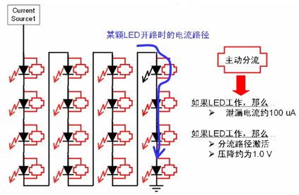 區域照明應用中通常會采用多串LED,雖然LED本身可靠性高,但若LED串中的某個LED開路,那么整串LED就可能關閉,而街道照明等應用中必須避免這種狀況,從而降低后期維護成本。為了增強LED串的可靠性,這種安森美半導體推出了NUD4700 LED電流旁路保護器。NUD4700器件是一款分流器件,當LED串中某個LED開路時,就會提供電流旁路,確保整串LED不會關閉;而且恰當處理散熱的話,還可支持大于1 A的大電流,其工作原理如圖8所示。