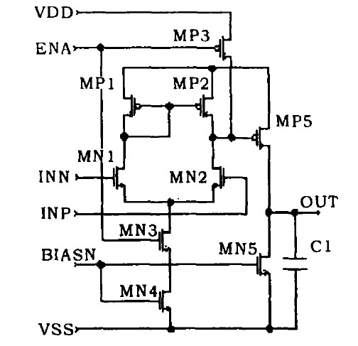 過放電檢測電路(VD2)可利用一個二級開環(huán)比較器來實現(xiàn),如圖2所示。在設(shè)計中應采用差分輸入并盡可能地提高增益,以滿足精度要求。該電路中,第一級是由MN1,MN2,MP1,MP2,MN3,MN4組成的差分放大器。第二級是由MP5,MN5組成的單級放大器。前級放大器放大輸入的差模信號,后一級將前級的輸出進一步放大,以達到數(shù)字信號的輸出電平。該比較器電路的直流增益為: