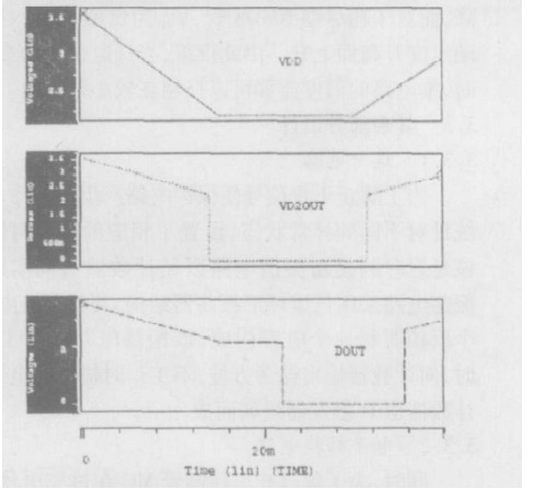 本芯片采用0.6μm的標準CMOS工藝。使用49級HSPICE模型進行仿真。圖4為過充電保護及復原波形圖,圖5為過放電保護及復原波形圖。